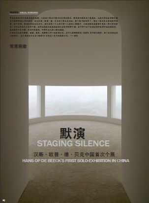 为他在中国的第一次个展,汉斯·欧普·德·贝克展示了一个巨大的三维装置,一个新的动画影片及一组新的黑白水彩画。艺术家为此展览命名为“默演”,是因为所有的作品都与舞台场景有关,从而引发沉默与思考。同时他也想谈论的是,相对于我们自身的死亡和伟大恒久的大自然,人类的无能及渺小。