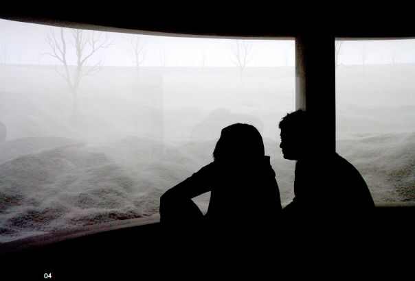 传统的景现结合了三维前景与背景画。“场景6”,却是一个完全的造型景观,没有人造雾和灯光。观众可以通过一个狭长的走廊到达中央观景台来观看景观。从一个坐着的位置,参观者由全景窗口看到辽阔的雪域和光秃的树木。景观,观景台及其内部全是白色的。与较早形式的全景式建筑相反,“场景6”这个装置不打算进行娱乐或教导。艺术家却利用远景的无限性来吸引参 观者的眼睛进行内观沉思的自我。
